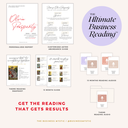 A personalized, detailed natal chart & tarot guided business reading that includes a yearly overview and 13-month forecast—revealing exactly when and how to leverage your astrology chart for maximum impact and premium positioning.
